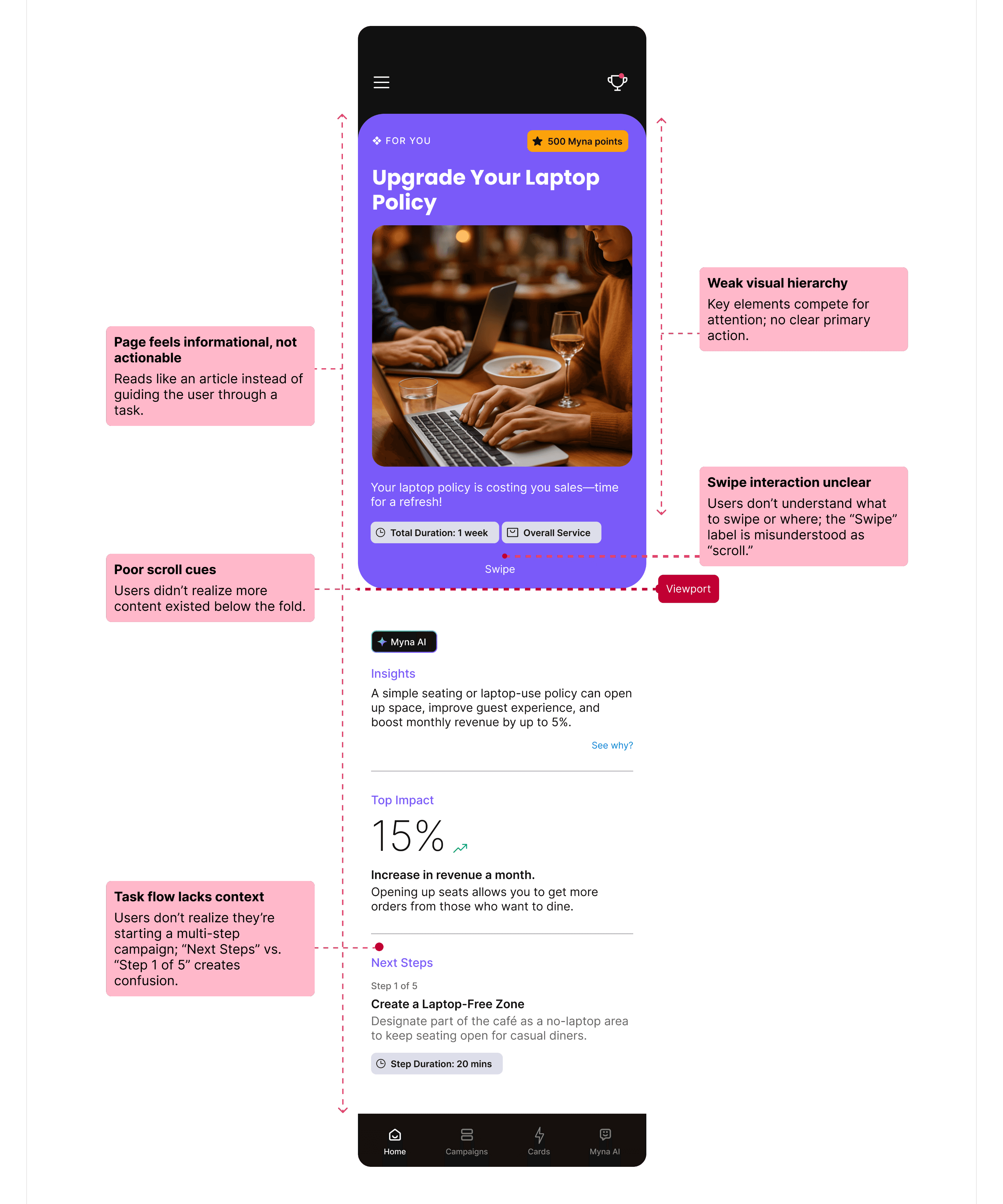 UX Audit and user test issues mapped on swipe cards