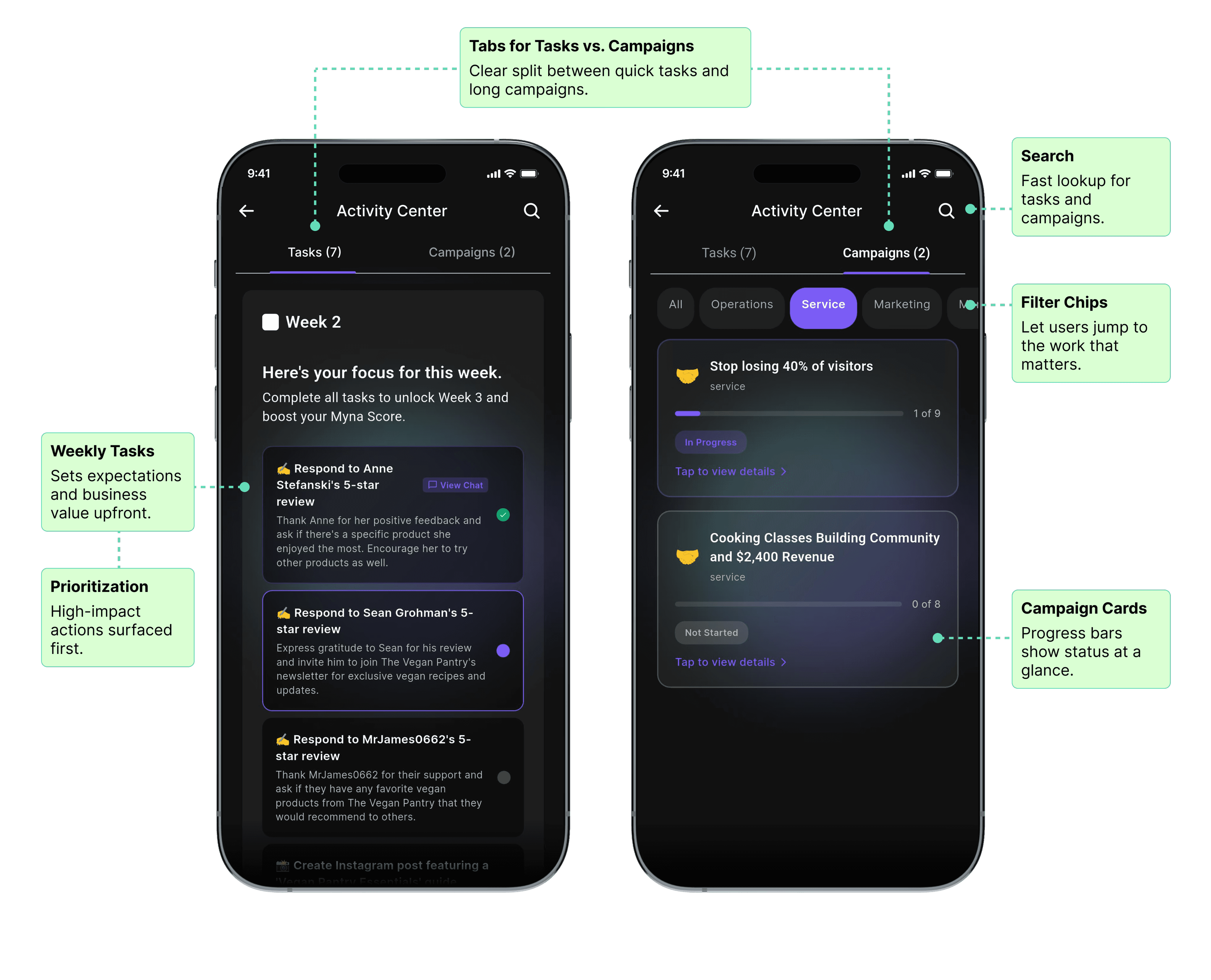 Myna launched as a swipe-based marketing assistant. Owners could swipe right to approve suggested actions or swipe left to dismiss them “one gesture, zero friction.”