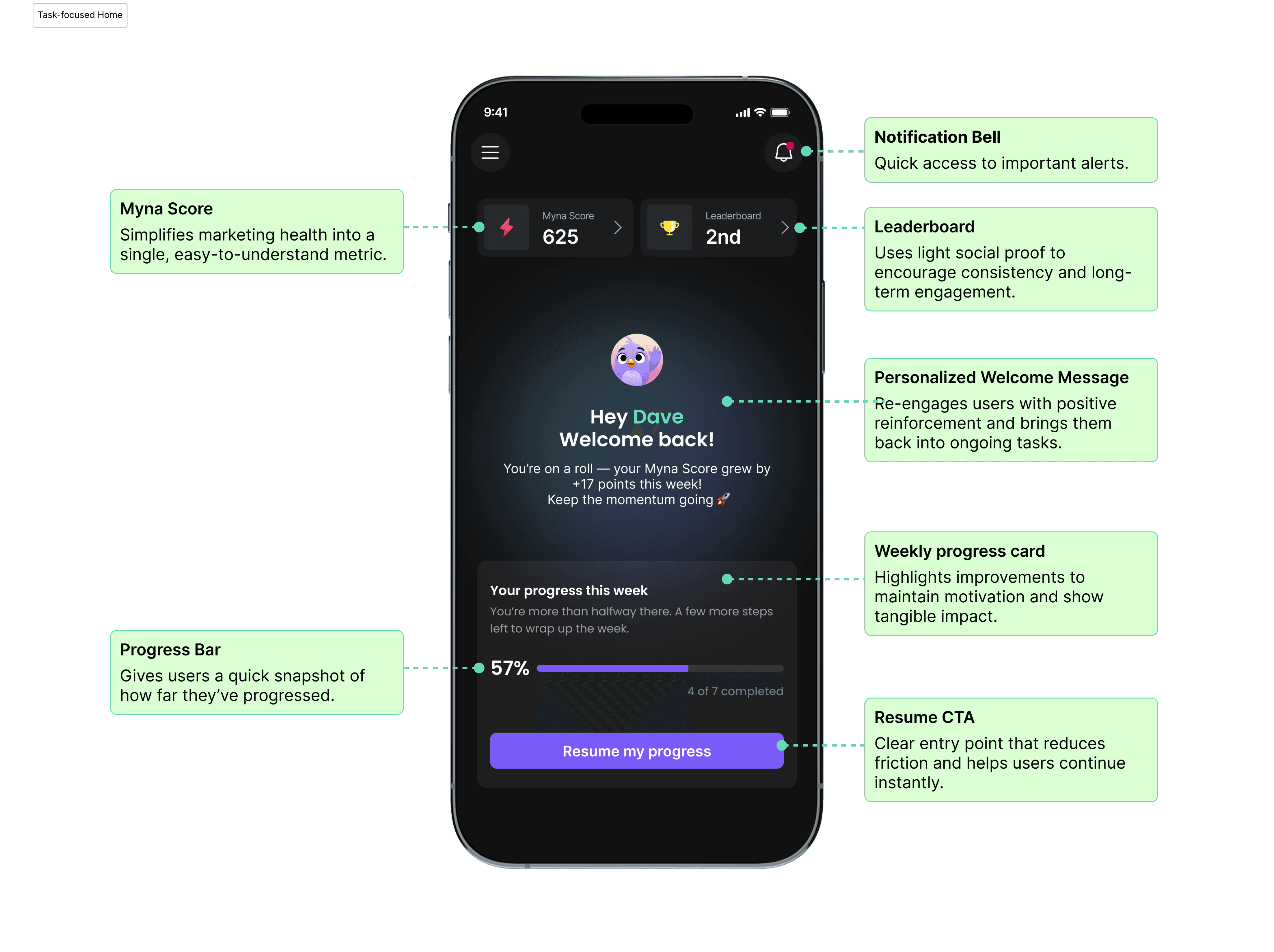 Myna originally shipped as a swipe-based “approve/dismiss” AI assistant. Early testing showed that speed didn’t translate to action or trust.
